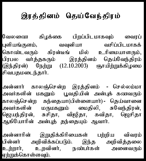 rasa (son) Rajendran Passed Away on 03/09/2008 at Esumoddai, Jaffna.