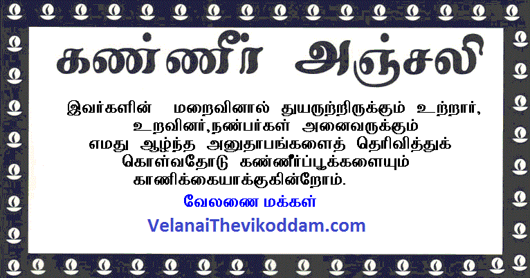 செவ்வாய்கிழமை வேலணையில் காலமானார். இறுதிக் கிரியைகள் பற்றிய விபரம் பின்னர்